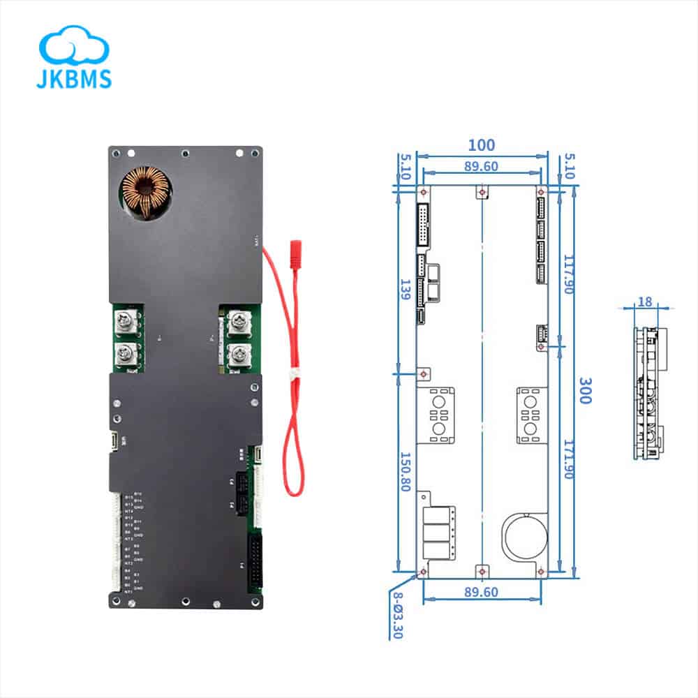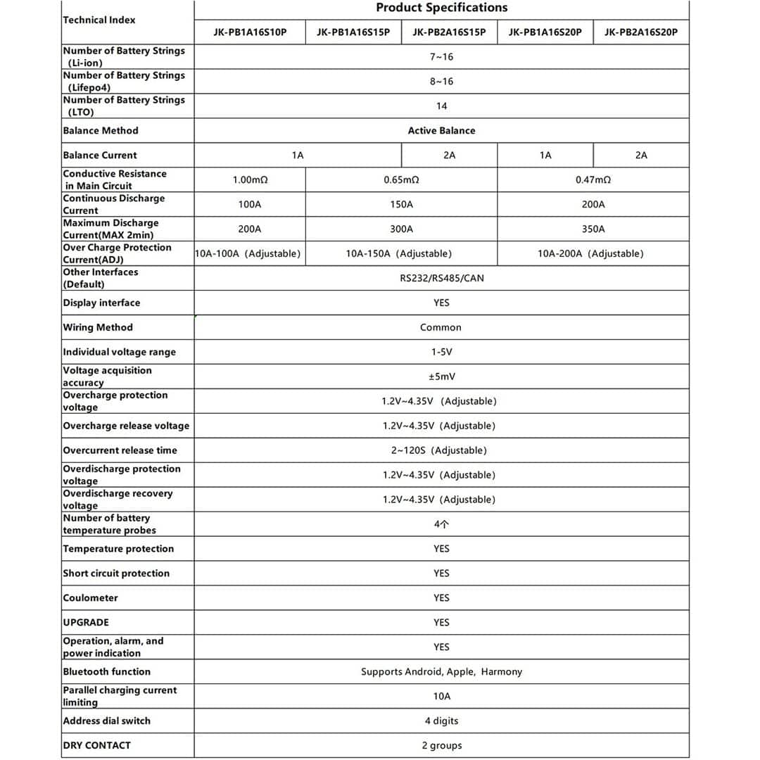 JK-PB1A16S10P BMS, 7-16S Li-ion, 8-16S LiFePO4 ve 14S LTO bataryalar için 100A akım ve 1A aktif balans desteği sunar. Hücre dengeleme, güvenlik ve yüksek verimlilik bir arada!